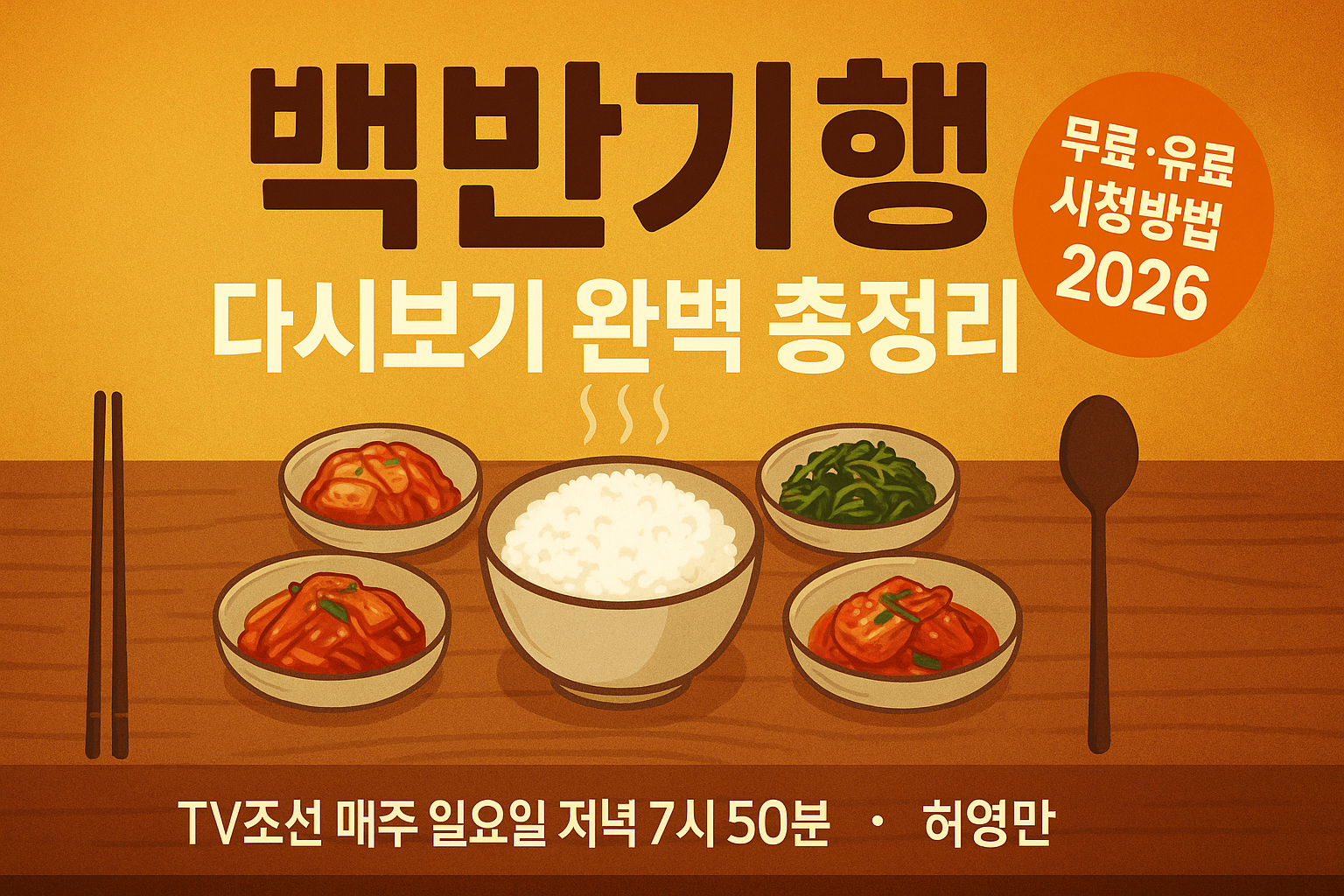 한줄 요약: 백반기행은 TV조선 매주 일요일 저녁 7시 50분 방영, 다시보기는 티빙(TVING)·웨이브·왓챠, 무료 클립은 TV조선 공식 유튜브에서 볼 수 있습니다. 백반기행은 어떤 프로그램인가요? 식객 허영만의 백반기행은 만화 ‘식객’으로 유명한 만화가 허영만이 매회 특별 게스트와 함께 전국 각지의 백반집과 숨은 맛집을 탐방하는 TV조선 대표 음식 교양 프로그램입니다.2019년 5월 14일 첫 방송 이후 2026년 현재 337회 이상 방영 중인 장수 프로그램으로, 음식에 얽힌 인생 … 더 읽기