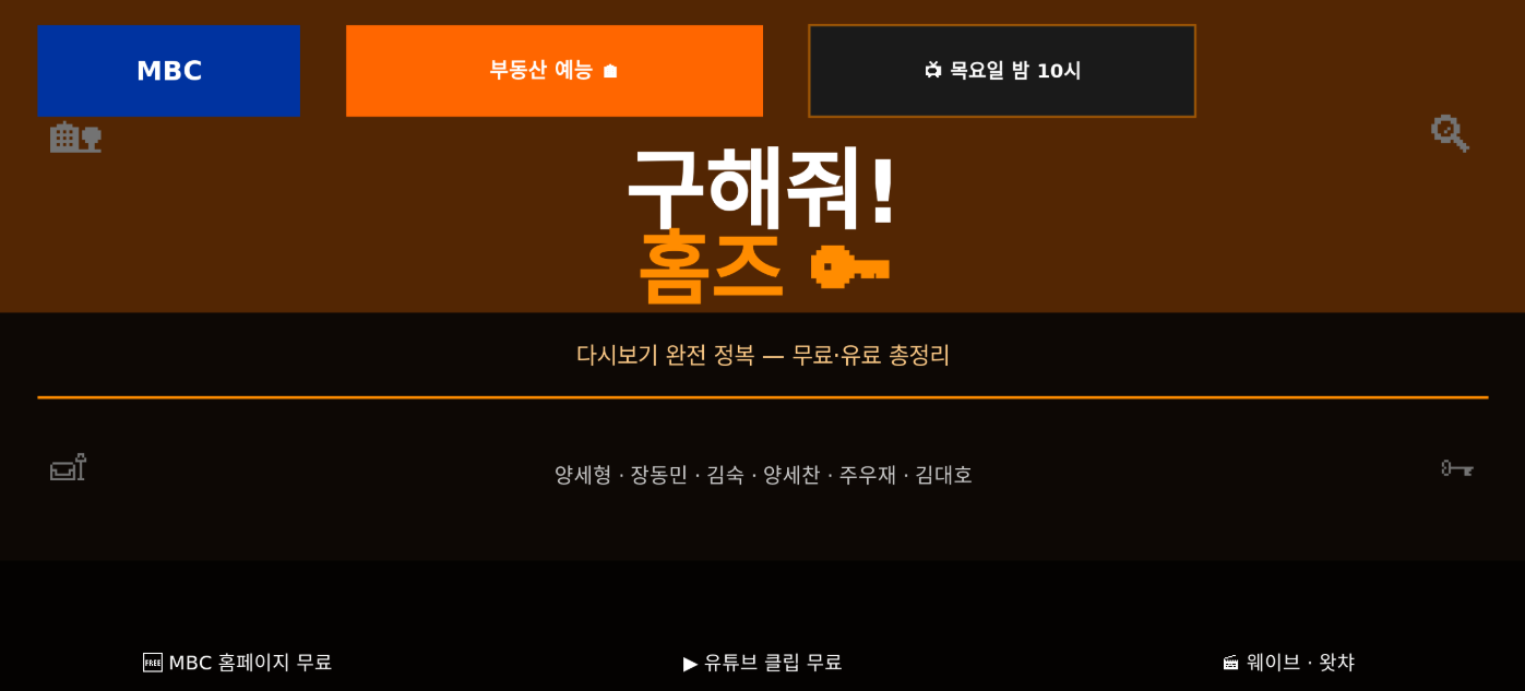 MBC 공식 유튜브 채널에서 주요 장면 클립과 풀영상 일부를 무료로 공개합니다. 유튜브에서 “구해줘홈즈 MBC” 검색하면 바로 찾을 수 있어요!