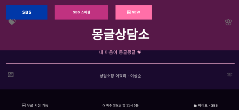 한줄 요약: 몽글상담소는 SBS 스페셜 일요일 밤 11시 5분 방영, 무료 다시보기는 SBS 공식 홈페이지, 전편 스트리밍은 웨이브에서 가능합니다. 몽글상담소는 …